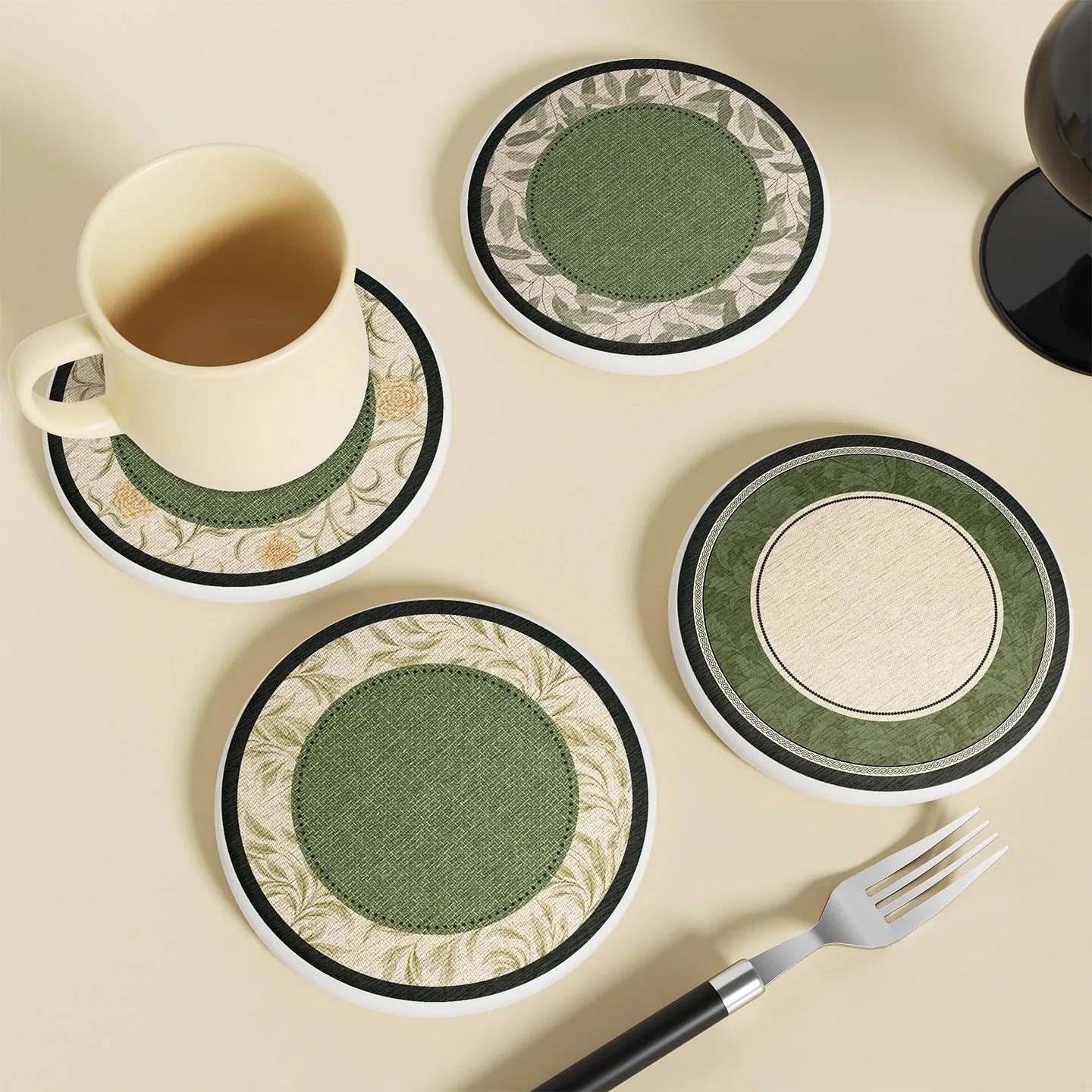 北欧スタイルの丸型コースター - 耐熱・防焼け・高温対応!コーヒーの水分をしっかり吸収し、汚れに強い珪藻土製。おしゃれで機能的なインテリアアイテム!