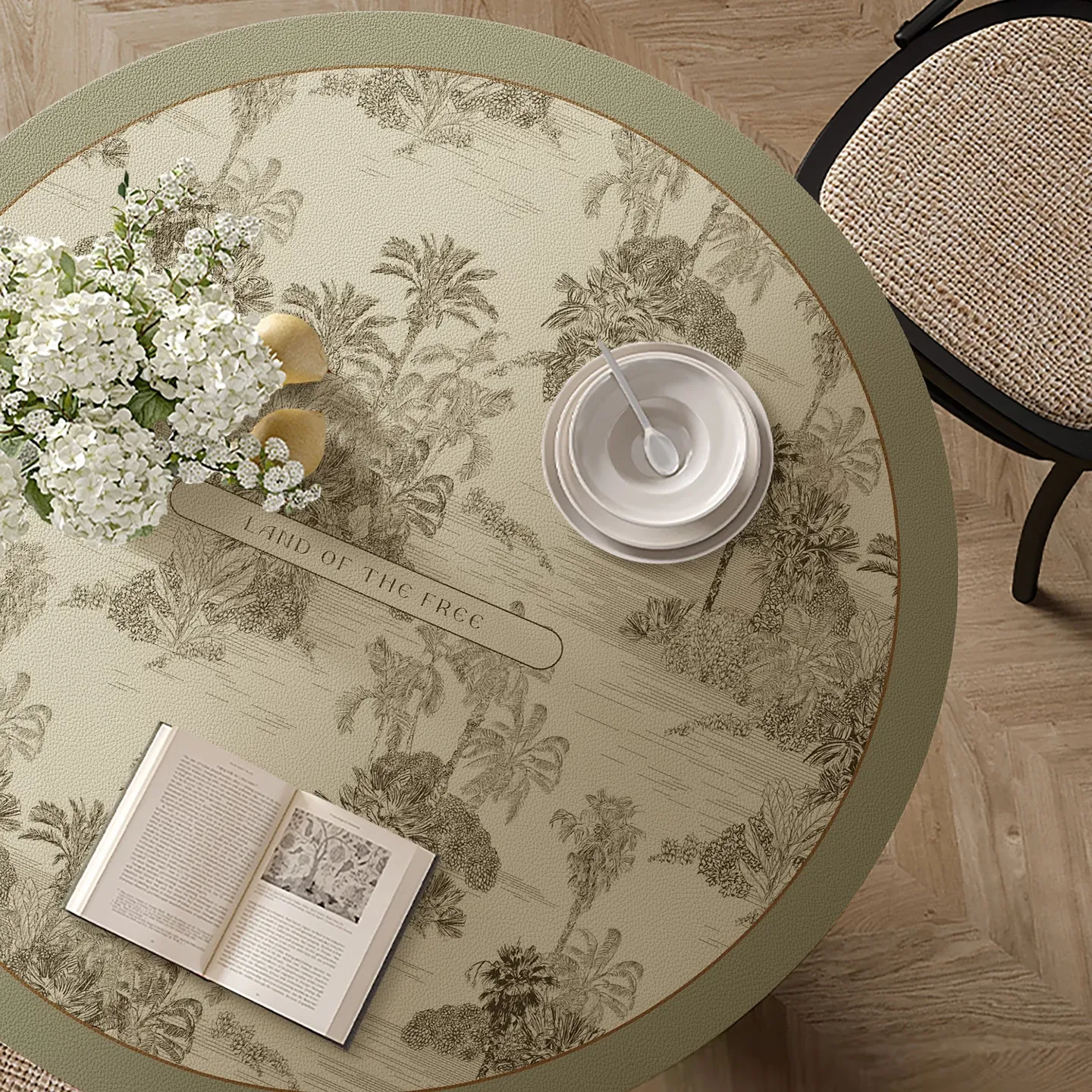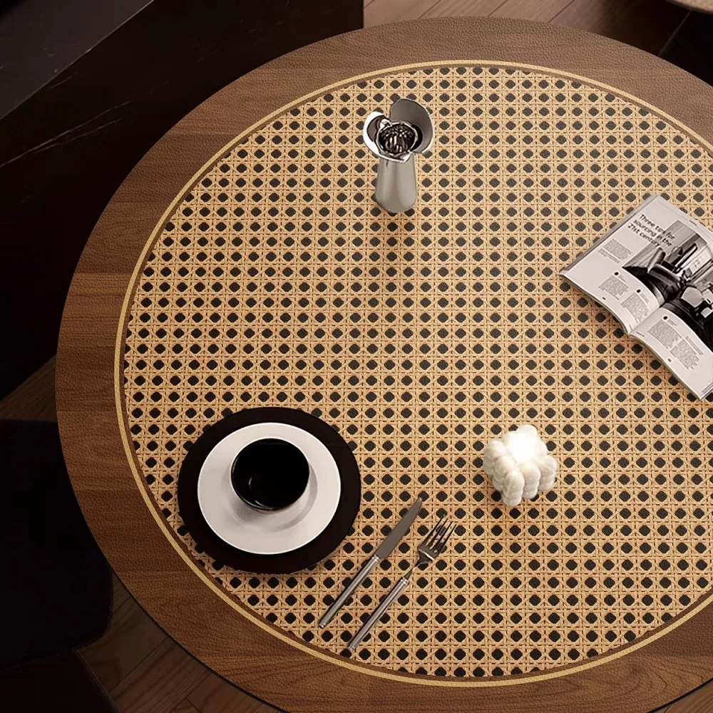 ヴィンテージ風レザー製ラウンドテーブルマット 防水・防油・耐熱の洗濯不要デザイン!テーブルやデスクをしっかり保護するおしゃれなアイテム。お茶や食事の時間をもっと楽しく!
